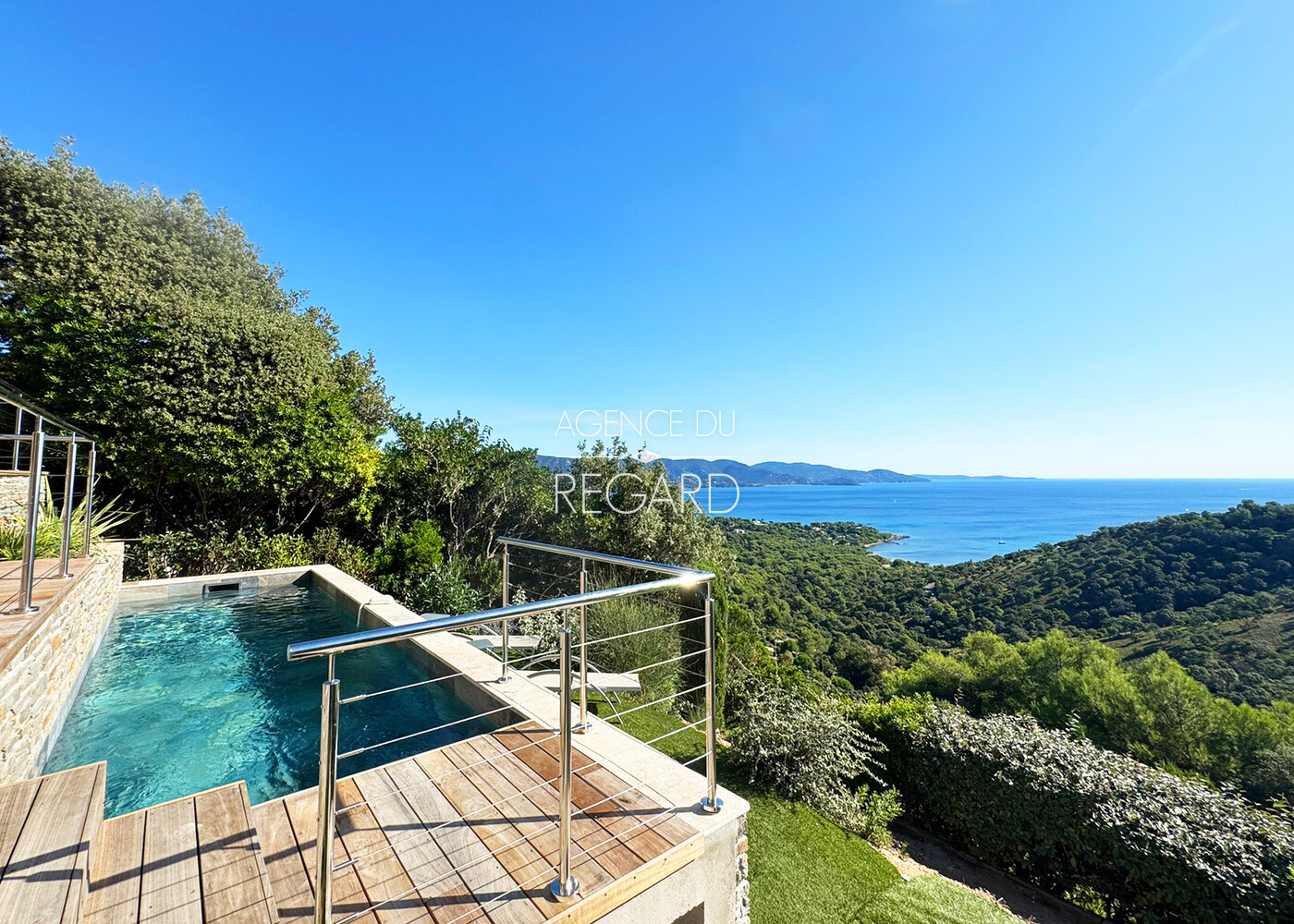 In Bormes-les-Mimosas, in the private and guarded Gaou Bénat estate, this 813sqm property offers sweeping views of the sea, Levant island, and Cap Bénat below. A pool area also benefits from this sumptuous sea view. This tastefully renovated villa of 164sqm offers 4 bedrooms. A charming shaded patio, protected from the prevailing winds, offers a transparent sea view. Garage. DPE : D ; GES : B.