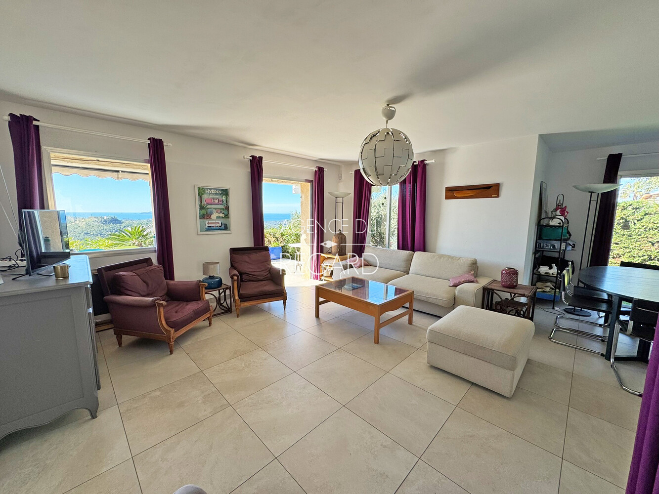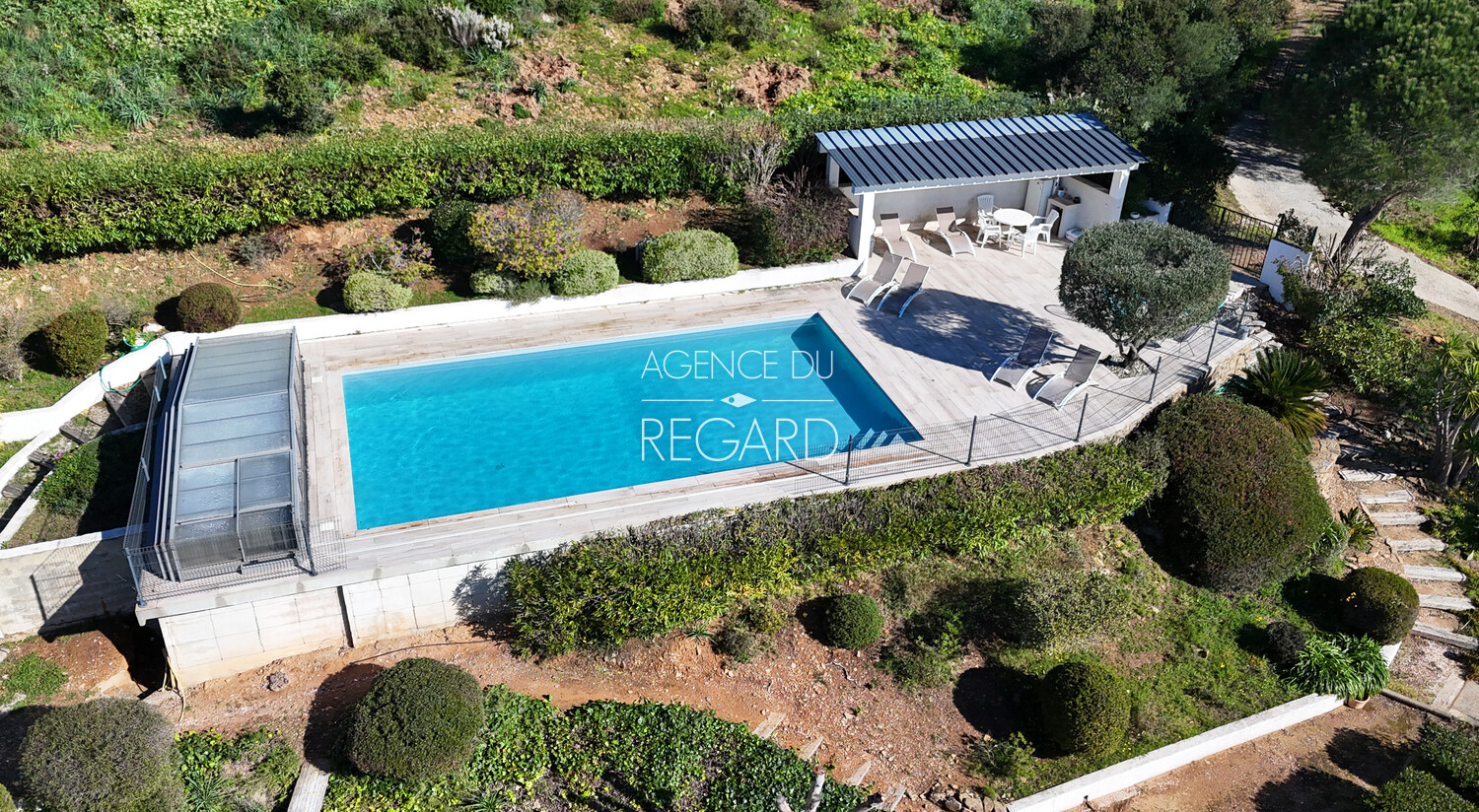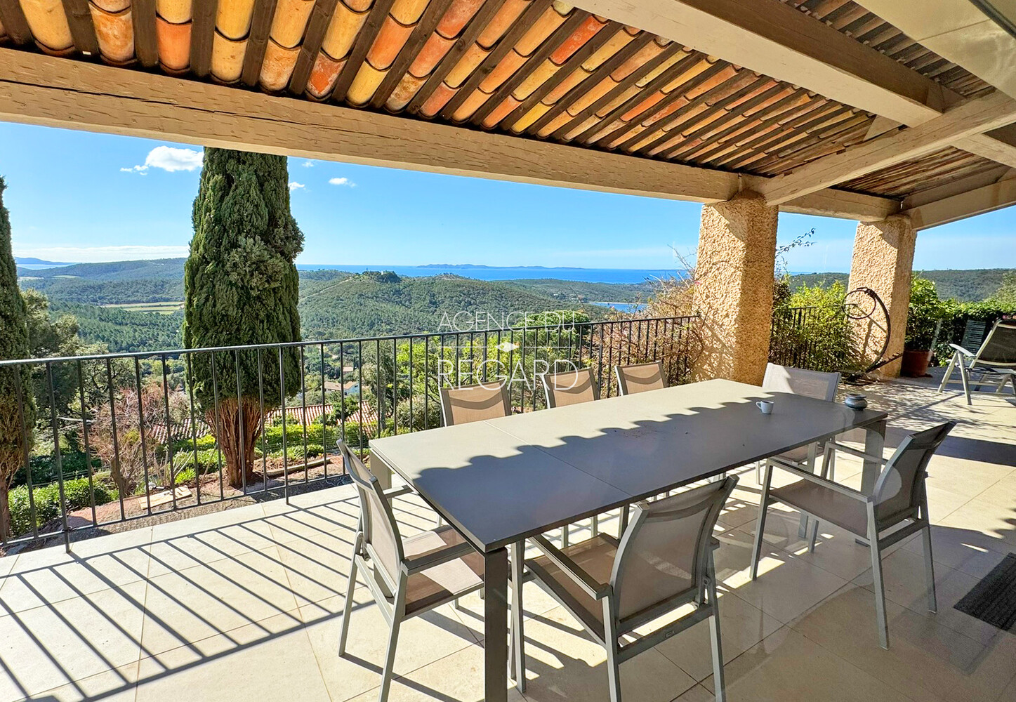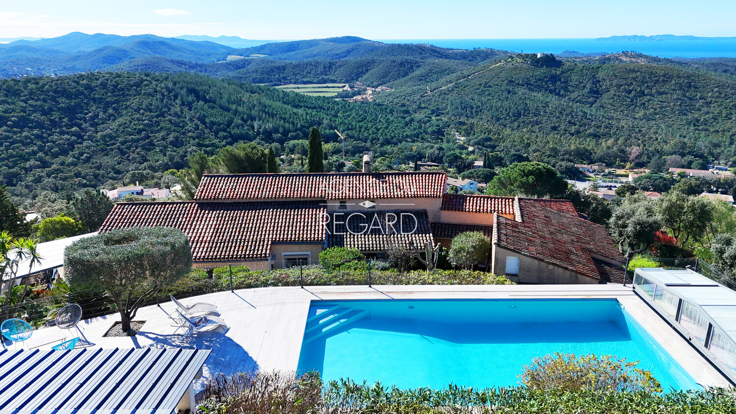This 2,24sqm property is located between La Londe-les-Maures and Bormes-les-Mimosas, 15 minutes drive from their beaches and harbors. Situated atop a hill, the land is fully fenced and landscaped with wide terraces. It offers exceptional panoramic views of the sea, Golden islands, as well as Mount Coudon and Mount Faron. The traditional villa, of 260sqm, features a spacious 70sqm reception room extending onto a covered terrace with magnificent sea views. There is also a separate apartment, a pool house, an 11x6m swimming pool, a hammam, a pétanque court, two cellars, and a carport.